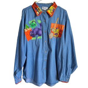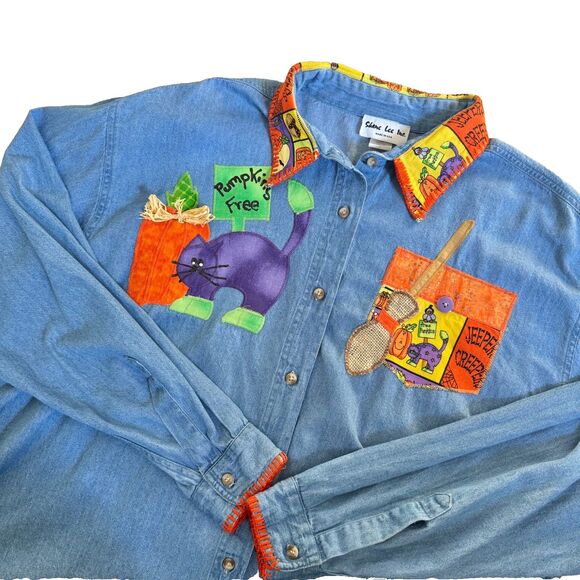 Vtg Shane Lee blue denim Halloween applique button up shirt Womens 2XL (fits XL)