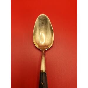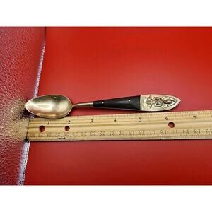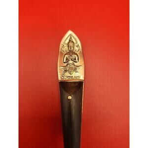 This vintage Siam Sitting Buddha brass sugar spoon teaspoon with a wood handle is a unique and retro collectible piece designed for all occasions. The spoon features a dark brown wood handle (partial)and a gold color, with the iconic Sitting Buddha theme representing Thai culture. Measuring 6.5 inches in length, this spoon adds a touch of elegance to any kitchen or home decor. Made in Thailand, this spoon combines traditional craftsmanship with a modern style, making it a standout piece for any adult's department.
