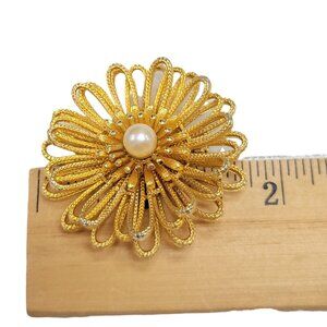 Vtg Signed Capri Gold-Tone Flower Brooch Faux Pearl CenterOpen Petals