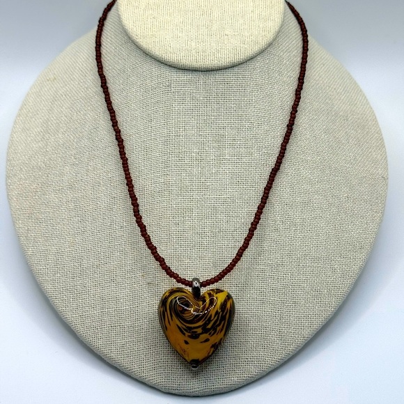 Heart Pendant Necklace is stringed with amber-colored glass seed beads.