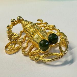 Add a touch of elegance with this stunning gold and green scorpion brooch. Perfect for any occasion.