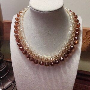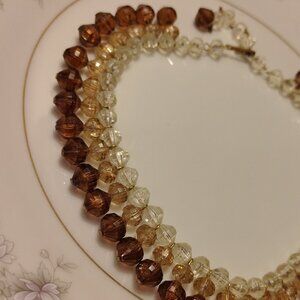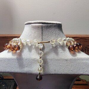 I love this stunning choker! It is truly breathtaking. This vintage West Germany Tiered Strand Faux Crystal Lucite Choker Collar Necklace is a beautiful and unique piece of fashion jewelry. The necklace features a tiered, beaded design with a bib-style choker collar, perfect for all occasions. Made of lucite and metal in a gold-tone finish, the necklace is adjustable in length from 14-17 inches. The extender is beaded as well. The multicolored main stones of amber, brown, and clear add a touch of retro charm to the piece, making it a standout accessory for any woman's jewelry collection. You will not be disappointed with this rare beauty! Just a little wear on closure hook. Please see the photos—otherwise, it is in stunning excellent condition.