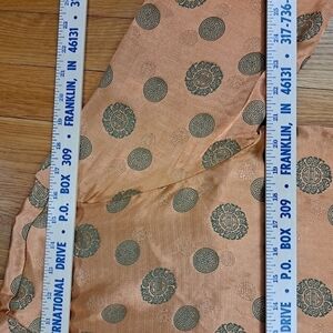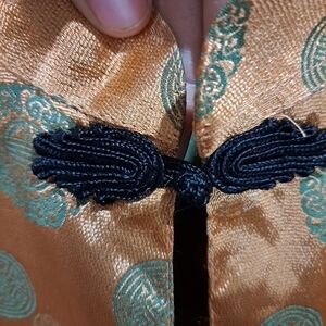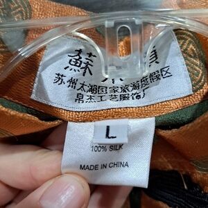 Vintage 100% silk orange and green metalic Medallion print open front Asian jacket kimono Mandarin Collar Size large See pictures for lay flat measurements Approximate measurements armpit to armpit 20.5" shoulder to shoulder 16" shoulder to hem 22.5" Few snags in silk Lightweight