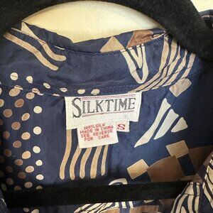 Vtg Silktime Womens Button Up Shirt Small Geometric Print 100% Silk 90s Blue