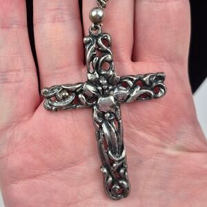 Vtg Silver Ivy Cross Necklace 23" Victorian Style Gothic Openwork Crucifix