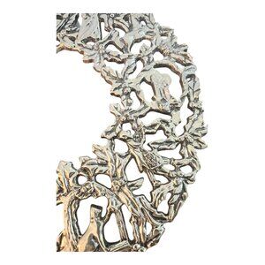 This intricately designed silver-plated wreath serves as both a functional trivet and an elegant wall hanging, featuring festive holiday motifs for a decorative touch. by Elegance Silver.
