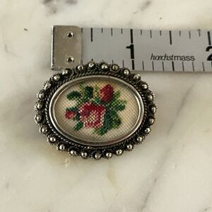 Vtg Silvertone Oval Petit Point Hand Embroidered Floral Rose 1.25"Brooch Pin