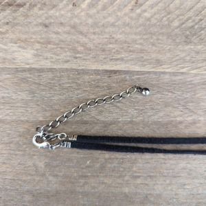 Vintage Silver-toned Flower Choker / Necklace with Blue Opalescent Stones on a Black, soft leather cord with a lobster claw clasp.. It is in great condition. Length is 16" (from end to end) with an extender that is 3" long. It is not signed.