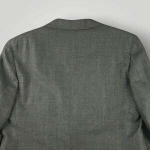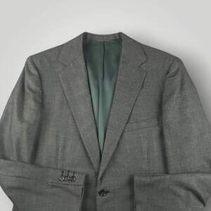 Elevate your wardrobe with this distinguished vintage, bespoke half-canvased two-piece suit! Perfect for the discerning gentleman, this suit exudes old-money charm and Ivy League sophistication. Ideal for business casual settings, preppy events, or making a dapper statement. The muted gray glen check plaid pattern and classic fit create a timeless, refined look. The suit pants will provide a high rise, slim fit through the waist and seat and transition to a tapered, wide leg ending in a cuffed hem. The suit pants have suspender buttons for that extra touch of sophistication and classic ivy league style. The suit pants will provide a high rise, slim fit through the waist and seat and transition to a tapered leg ending in a cuffed hem. Sizing is based upon measurements and intended fit.