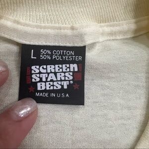 This vintage 1990s Screen Stars women's T-shirt is a unique and eye-catching piece with a bright yellow color and abstract nature-inspired graphic design. Made from comfortable cotton material, this single stitch shirt exudes a casual and artsy look, perfect for any occasion. The regular fit and medium to large size make it a versatile addition to any wardrobe for those who appreciate retro fashion and bold statement pieces.