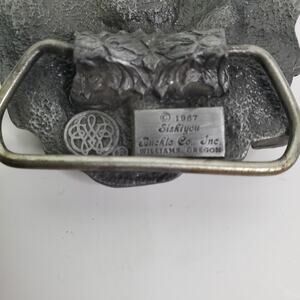 The product is a vintage Siskiyou belt buckle from 1987, featuring a cowboy and western theme with imagery of hunting deer, ducks, and rifles. Made of metal and showcasing a rockabilly look, this original piece is perfect for adult unisex wearers looking to add a unique accessory to their collection. Made in the United States, this multi-color buckle captures the nostalgia and style of the 1980s era.