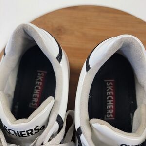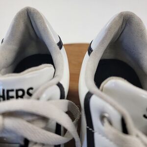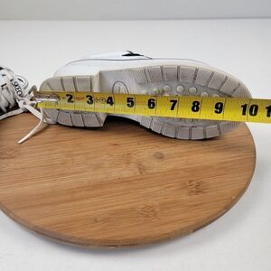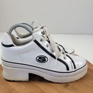 These vintage Skechers 90s Y2K platform booties, also known as Jammers, feature a 2-inch chunky heel with a round toe and lace-up closure. The white leather boots have an embroidered logo accent and a solid pattern. They are designed for women in size 7 (UK size 6.5) with a standard shoe width. Perfect for a retro 90s theme, these ankle boots are suitable for travel, activewear, casual outings, and workwear during the fall season.