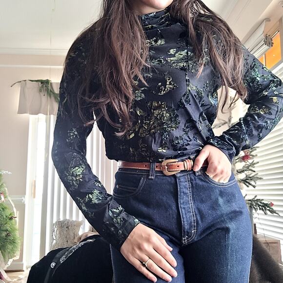 Vtg Sno Skins Green Blue Velvet Burnout Floral Long Sleeve Turtleneck Sz L