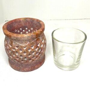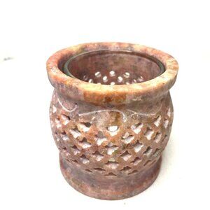Vtg Soapstone Votive Tea Light Holder w/ Glass Insert Pierced Carved Pink Purple