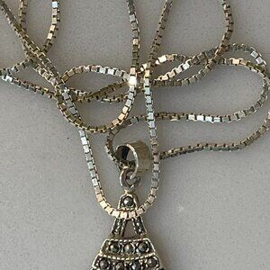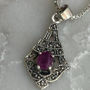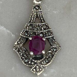Vtg. Solid 925 Marcasite Pendant w Natural Ruby on a Solid Sterling Box Chain