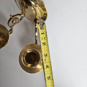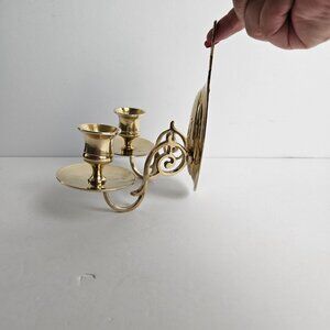 Elegant and timeless, this vintage solid brass wall sconce features a double candle holder design with ornate scroll detailing. The sconce measures approximately 6.25” tall x 6.5” wide, with each candle arm extending about 4.25” from the wall mount. The candle cups fit taper candles up to 7/8” wide.
