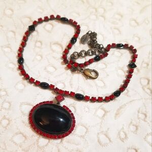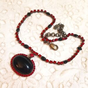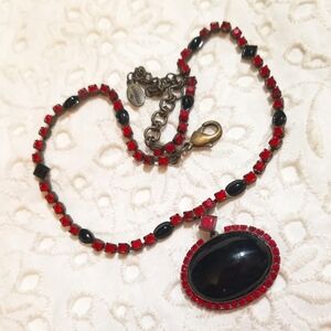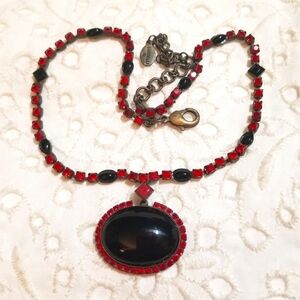 Beautiful Victorian Style Vintage designer signed Sorrelli Swarovski Crystal Necklace. The colors are rich pink and black set in brass. Please excuse reflections, all is in excellent Vintage condition. Measures 16" long and the Pendant measures 1.25" wide. This Treasure has a wonderful Gothic look & will certainly draw attention.