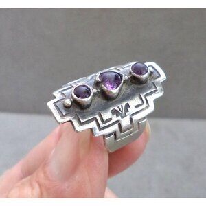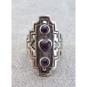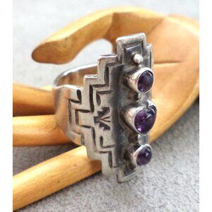 Vintage Southwestern 3 amethyst & stamped sterling silver tall ring