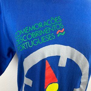 Vtg Souvenir Blue T-Shirt "Celebrations Portuguese Discoveries" Text Compass SM