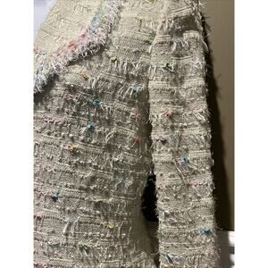 GORGEOUS!!!!!!This vintage St. John 2-piece skirt suit in pale green features a fringed front jacket and skirt with colorful threaded accents in size 2. The outfit is perfect for occasions like weddings, parties, formal events, workwear, or business meetings. The knit fabric offers stretch and comfort, making it ideal for the spring, fall, or winter seasons. With a skirt length of 22 inches and a classic design, this ensemble exudes a colorful and designer theme, making it a stylish addition to any woman's wardrobe.