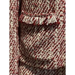 The vintage St. John Knit Size 2 Skirt Suit is a classic and stylish ensemble perfect for various occasions such as weddings, parties, workwear, and business meetings. The red and white tweed fringed jacket features a full zip closure and long sleeves The two-piece suit exudes a sophisticated and timeless appeal, making it a must-have addition to any woman's wardrobe.