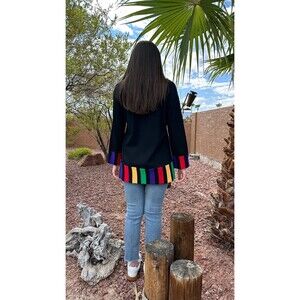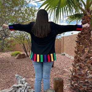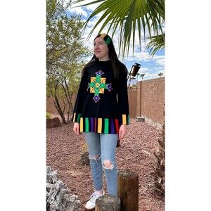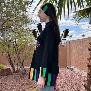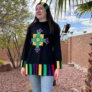 Knitted sweater with a cross in the center and matching headband. Cross has embellished patches and gold studs adding texture to the garment!