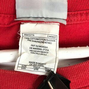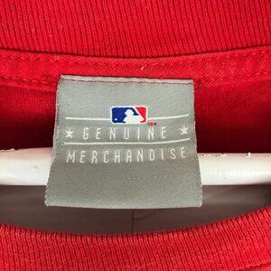 Show your St. Louis Cardinals pride with this Matt Holliday #15 red graphic t-shirt, officially licensed MLB Genuine Merchandise. Featuring the classic Cardinals script logo and player number on the front, with “Holliday 15” on the back, this tee celebrates one of the team’s standout outfielders. Made of 100% pre-shrunk cotton and tagged size 2XL, it’s manufactured in Mexico from U.S. fabric. This well-loved tee has visible wear, including some discoloration, faint stains on the front and back, and a small hole under the arm—perfect for fans who appreciate vintage sports style with authentic character.