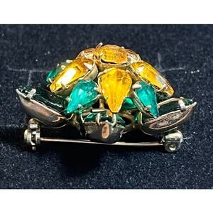 Vtg Starburst Rhinestone Brooch Amber Green Glass Stones, Mid Century Statement