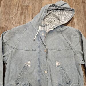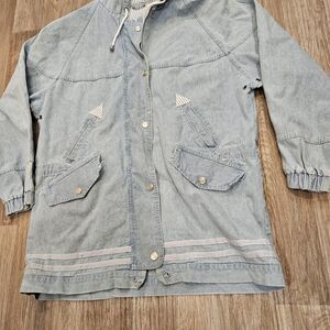 Vtg Stefano Denim Jacket Womens L Blue Chambray Coastal Boho Full Zip Hooded