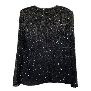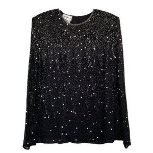 Vtg Stenay Silk Sequined Beaded Sheer Sleeve Evening Top Black Silver Size M