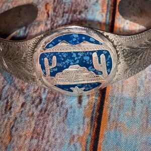 Vintage Mexico sterling silver with Turquoise desert scene cuff bracelet