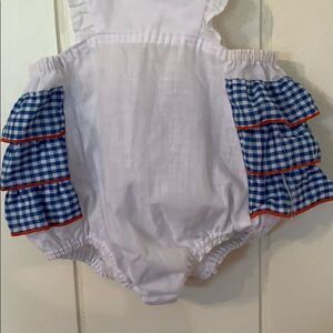 Vintage Stones Wear red, white & blue ruffled sun suit with Julie embroidered on front