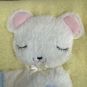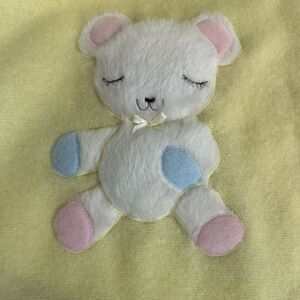 This vintage Storktex baby blanket is the perfect addition to any collection. Featuring a cute yellow teddy bear with a stainless steel trim, this blanket is sure to bring a smile to your face. Measuring 37 x 47 inches, it's the perfect size for snuggling up with your little one.