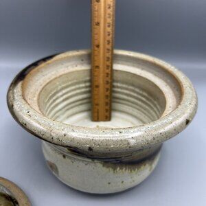 This vintage stoneware 1-quart casserole dish is a beautiful addition to any kitchen. The dish features a lid and handles, making it easy to serve and transport. The earthy colors and art pottery production style give it a unique look that is sure to impress. Inside measurements: 5” diameter x 3” height. Weight is 2lbs 13 oz