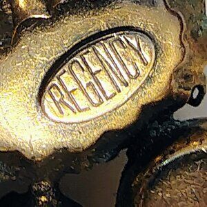 This stunning vintage Regency doomed faux baroque pearl and rainbow rhinestone brooch, signed REGENCY. The brooch features a champagne, cream, gold, and rainbow color palette with a gold tone metal base. Made of glass and rhinestone materials, the piece is set in a pie crust prong style with a baroque main faux pearl shape. This original vintage brooch was made in the United States and is a perfect addition to anyone's vintage collection. Very good vintage condition, a tiny dot on top of one of the pearls. I do not know if it was made that way or not. Please see photos. 1950s.