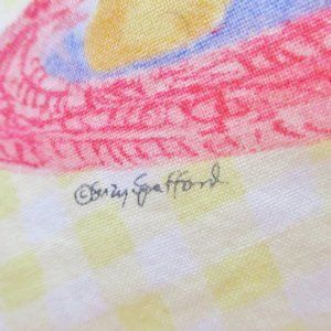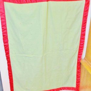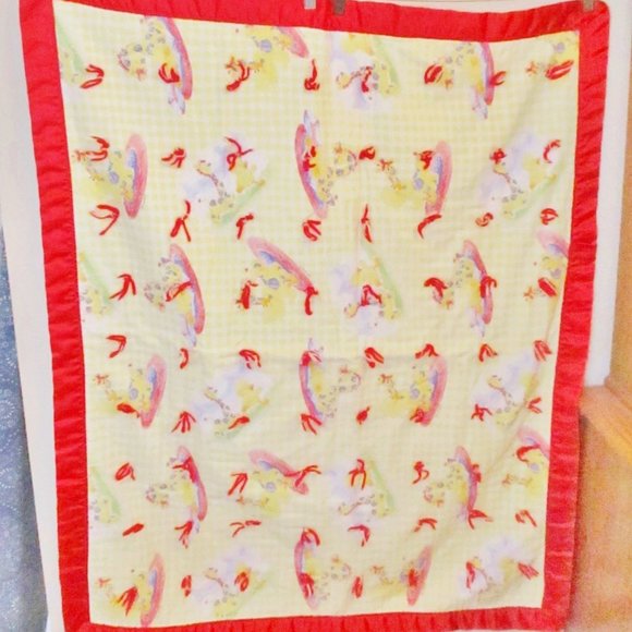 Vintage Suzy Spafford baby blanket / throw. Yellow and white check with baby animals (ducks and giraffes) on front, red satin trim and green (flannel ?) on back. This blanket can be used for either a baby boy or girl. It is adorable. This blanket is in excellent pre-owned condition. No holes, rips, tears or stains that I can see.