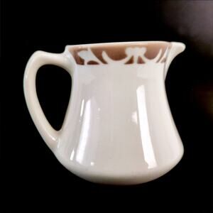 Vintage mid-century restaurantware creamer/syrup pitcher by Syracuse China USA. The underside is also marked "97-A, 42". It is made of a heavy white ironstone with nutmeg brown stencil design at the top edge. It measures 3-3/4" tall, 4-1/2" spout to handle, 3-3/4 diameter at its widest point.