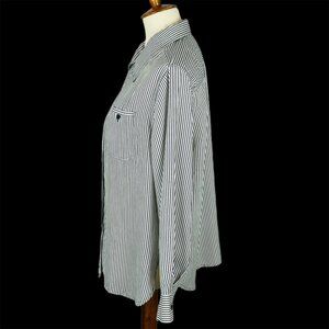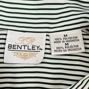 Vintage T.R. Bentley full button top in size medium. Dark olive green & white striped with a single button close breast pocket. Made in Indonesia of silky soft 100% polyester. Measures 22.5" armpit to armpit, 24.5" neck to tail, 23" sleeve. Excellent condition with no holes, tears, stains, or ripped seams. Smoke free, pet friendly home.