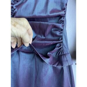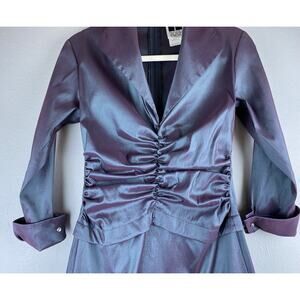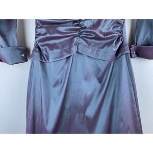 Vtg Tadashi Sz 4 Ruched Collared V Neck 3/4 Sleeve Jewel Cuff Full Shimmer Gown. Material is similar to color changing, back zipper,swing flare panels additional panel at center back. Many beautiful details Wired hem