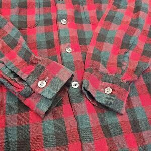 The product is a vintage tailored by McGregor 60's wool camp shirt for men in size 14-small. It features a plaid pattern in red and green, long sleeves, a button closure, and is made in the USA. The shirt is a classic piece with a lumberjack vibe, perfect for casual, travel, or workwear occasions. The fabric is a blend of rayon and wool, with a flannel type feel, making it a stylish and unique addition to any man's wardrobe.
