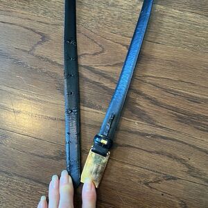 Vtg Talbots thin black leather belt with faux rectangle tortoiseshell buckle