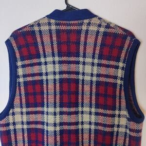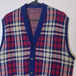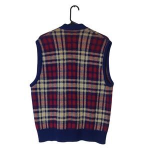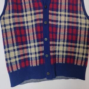 Vintage unbranded knit sweater vest cardigan. Red and beige tartan plaid with blue trim