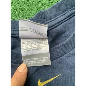 The product is a vintage Team Nike UC Berkeley men's XL blue football shirt with the Swoosh logo. It is officially licensed and made in Mexico. This shirt represents the UC Berkeley football team and is perfect for fans looking to show their support during the regular season. The Nike brand ensures quality and authenticity in this fan apparel, making it a great addition to any sports memorabilia collection.