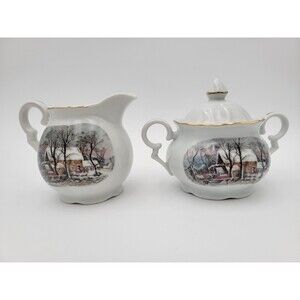 Vintage 1977 Avon Sales award - Teapot, creamer, Lidded Sugar Bowl, and bell featuring Currier and Ives design. Made in Japan. Very good pre-owned condition with no chips or cracks. There is a small dark spot on the teapot lid. Please see pictures.