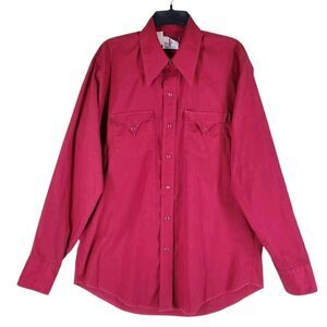 Featuring a red maroon color with button accents, this shirt has a regular fit and is available in size 16.5. It's perfect for those who love the Western, rodeo, cowboy, or retro themes and is a great addition to any wardrobe. Made in the United States, this shirt is chest-sized at 48 inches and is ideal for men who want to stand out from the crowd.