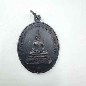 This Thai Buddhist amulet medallion showcases intricate craftsmanship with a serene Buddha and sacred symbols. A timeless spiritual artifact for collectors.