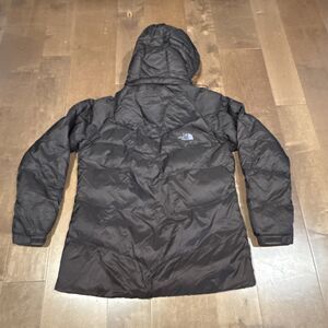 This is a vintage The North Face Summit Series 900 Puffer Jacket in size XL for women. It features a detachable hood and is made of brown nylon material. The style of the jacket is a puffer jacket, perfect for the colder seasons.