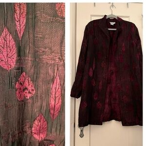 Festive cardigan with holiday embroidery. Features red and black panels. Embellished with holiday motifs.