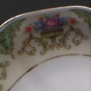 Floral ringed saucer with gold gilded detail. Some of the gold has worn away. Either Vintage or Antique in age. Stamped Bavaria Tirschenreuth The Shannon. Measures approximately 5 1/2" x 5 1/2". Good condition with no chips or cracks.
