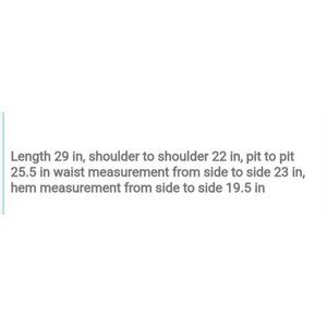 Length 29 in, shoulder to shoulder 22 in, pit to pit 25.5 in waist measurement from side to side 23 in, hem measurement from side to side 19.5 in